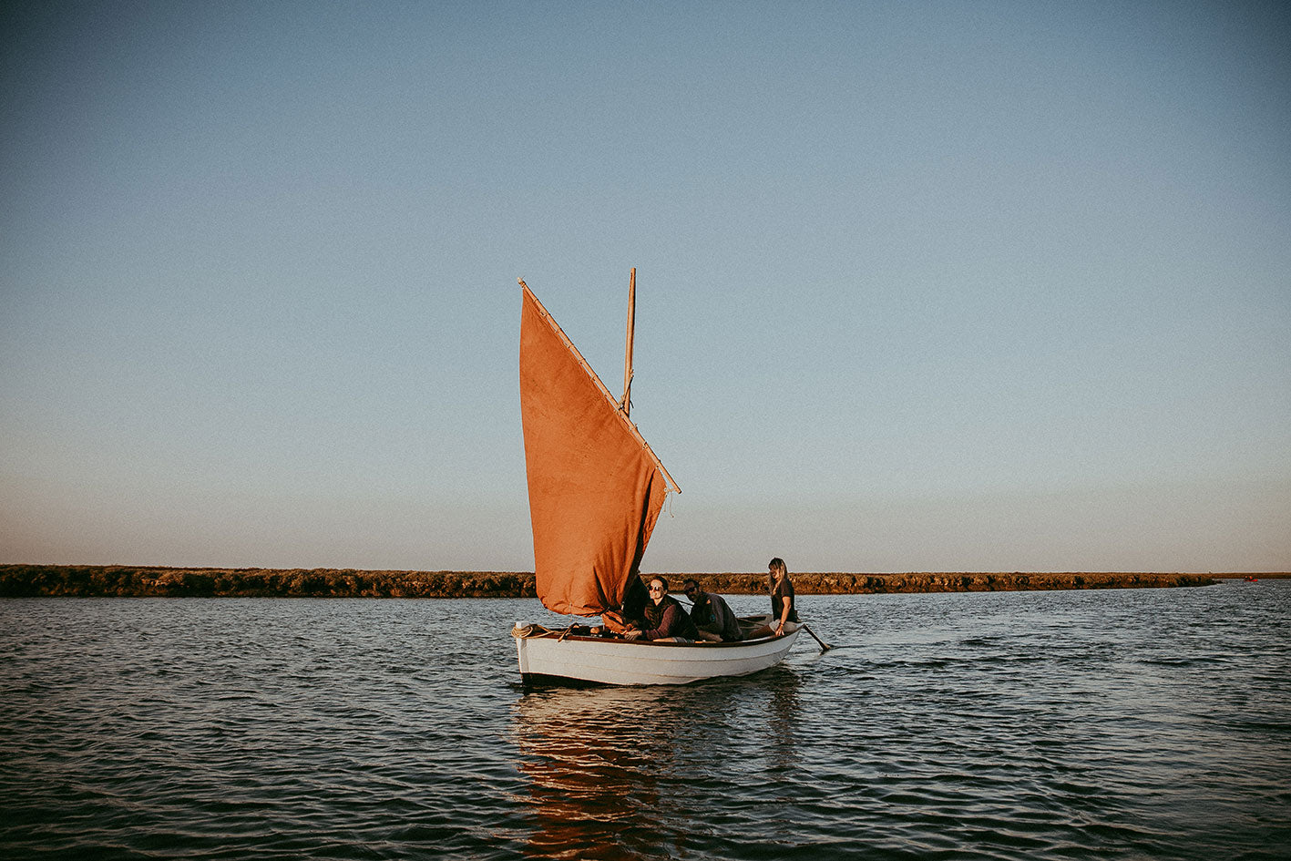 Mussel Flat; sailing with a lug rig and sculling with a long oar